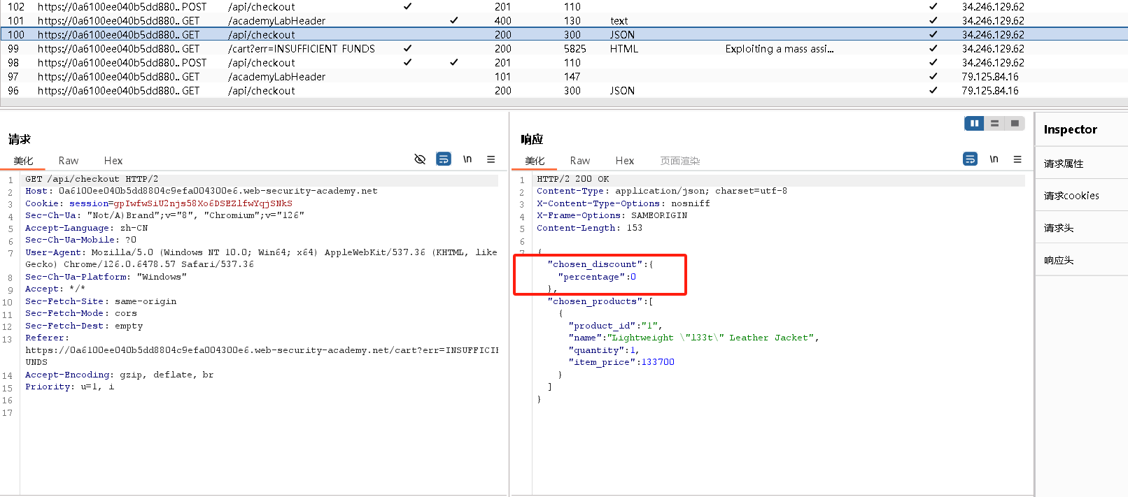 打开burp转到HTTP历史记录中查看记录,找到更新电子邮件地址时发送的请求,也就是PATCH /api/user/wiener然后将这个包发给重放器,这表明了如何通过API获取用户wiener的信息。