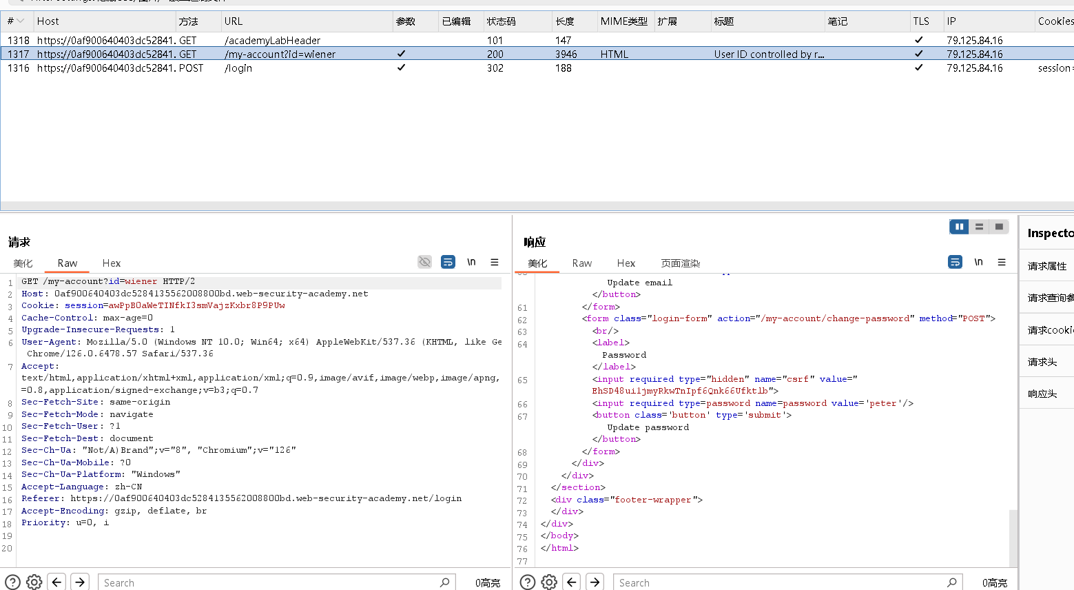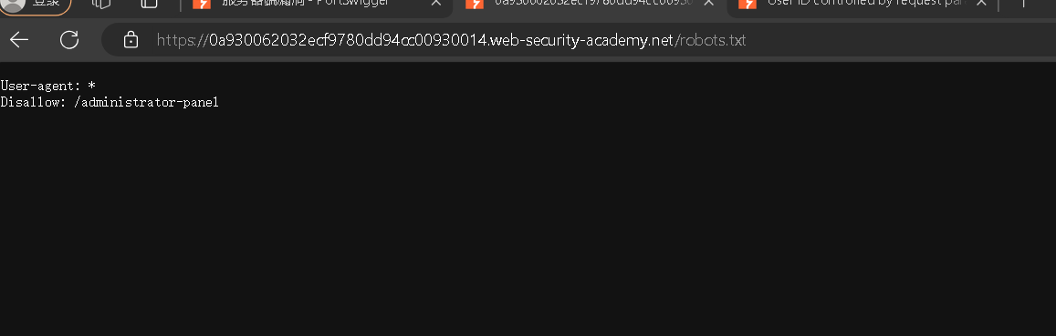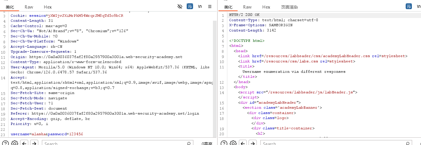 首先我们先正常登录账号,然后审计自己登录的代码,发现在响应的时候,我们找到了自己的密码,说明会泄漏密码,我们修改id为administrator,就可以在响应中得到它的密码