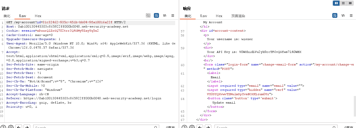 此实验室在用户帐户页面上存在一个水平权限提升漏洞,但使用 GUID 标识用户。