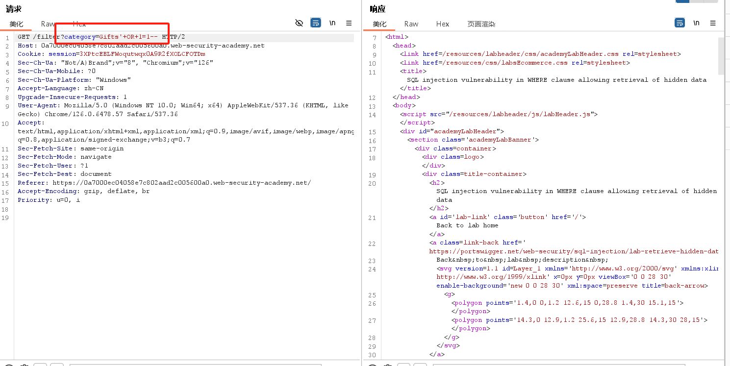 实验室:WHERE 子句中允许检索隐藏数据的 SQL 注入漏洞