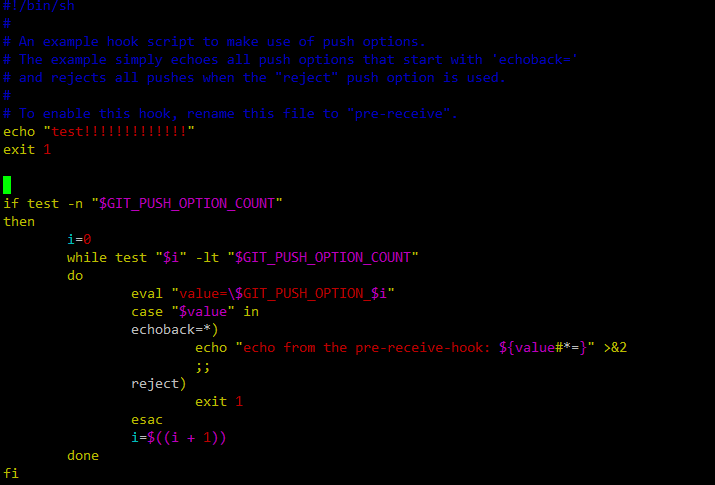 各位大神,请教一个问题,我自己搭建了一个git server, 我想在server上启用pre-receive这个hook,于是就把hooks里的pre-receive.sample改成了pre-receive, 脚本如下: