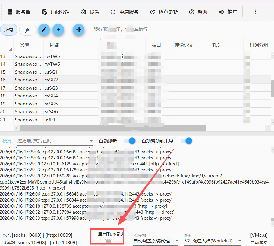 既然 Antigravity 不支持HTTP代理,我们可以开启 tun 模式解决,原理是通过创建一张虚拟网卡,从底层捕获并转发所有流量,这样就可以代理所有软件,不管关系软件支不支持。目前大部分科学上网工具都支持开启tun模式。