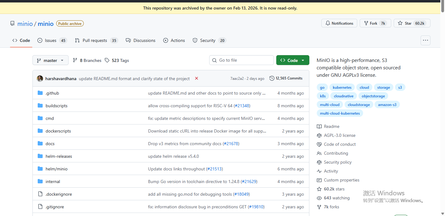 作为著名的开源对象存储,拥有60k stars, 超10亿次docker拉取,MinIO 不在维护。